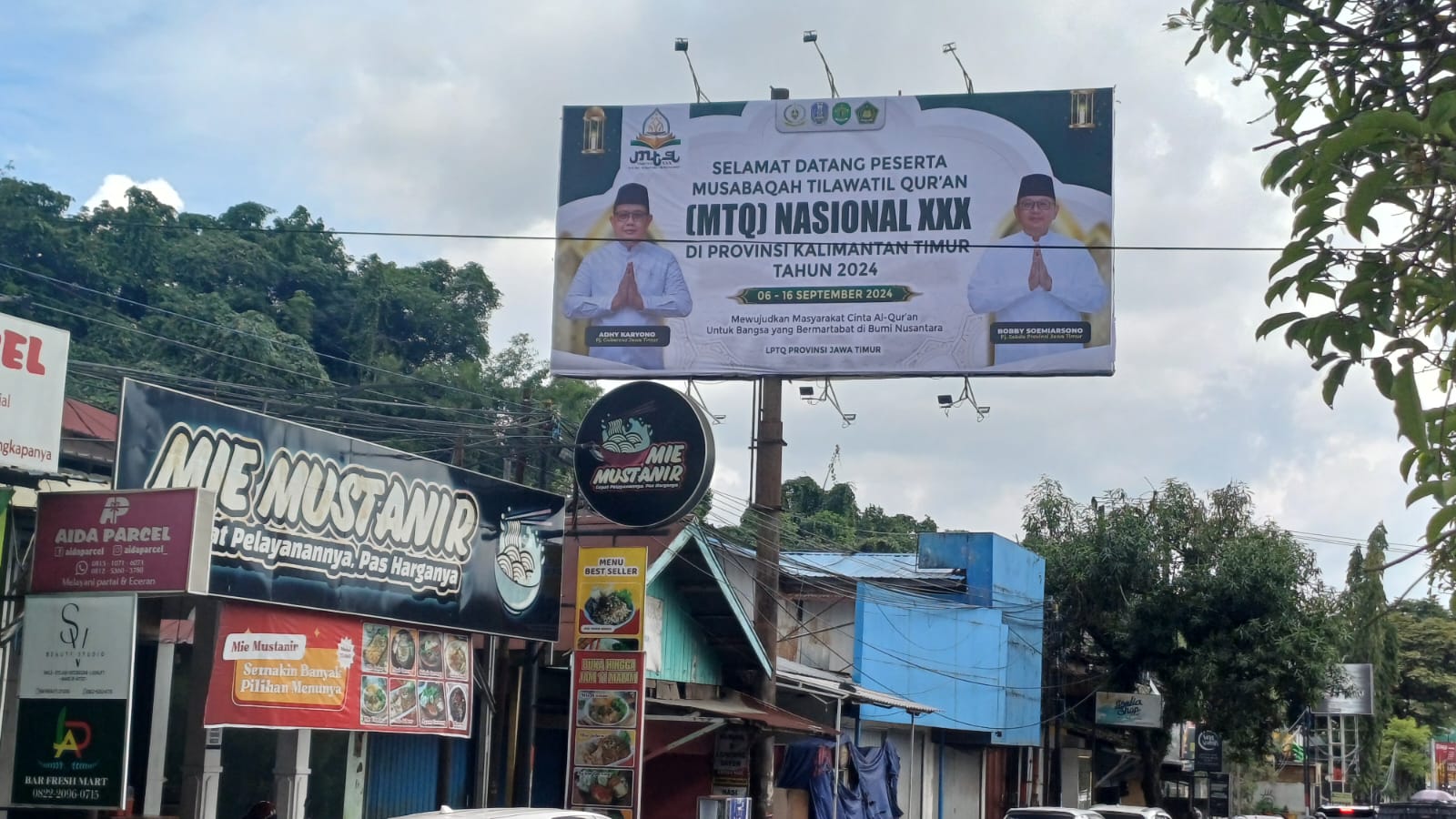 Baliho berukuran sekitar 4 x 8 meter itu terpasang tepat di pintu masuk utama Kota Samarinda. Gambar kedua pejabat tersebut tampak sedang tersenyum lebar sambil menyapa salam kedua tangannya. Di bawah gambar tersebut, terdapat tulisan besar yang berbunyi “Selamat Datang Kafilah MTQ Nasional XXX Tahun 2024”.