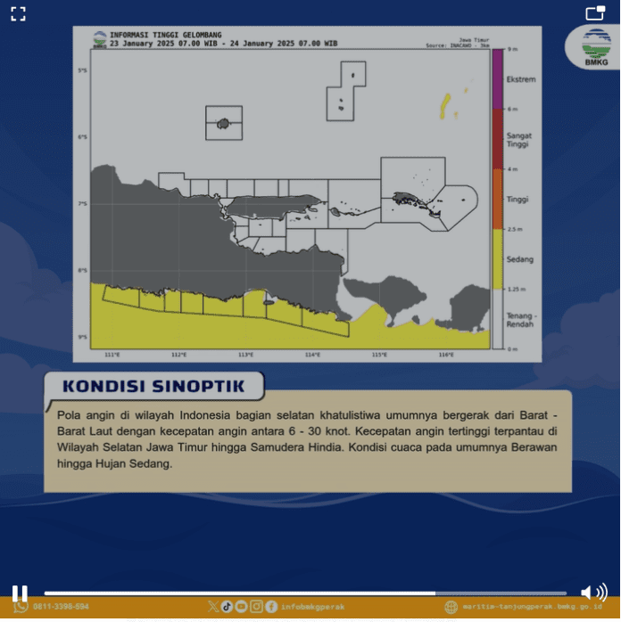 Surabaya 23 Januari 2025 | Draft Rakyat Newsroom- Badan Meteorologi Klimatologi dan Geofisika (BMKG) Maritim Tanjung Perak Surabaya mengeluarkan peringatan dini gelombang tinggi di Perairan Jatim pada 22 hingga 25 Januari 2025. Ketinggian gelombang ini diperkirakan antara 2,5-4 meter, utamanya di perairan Lumajang.