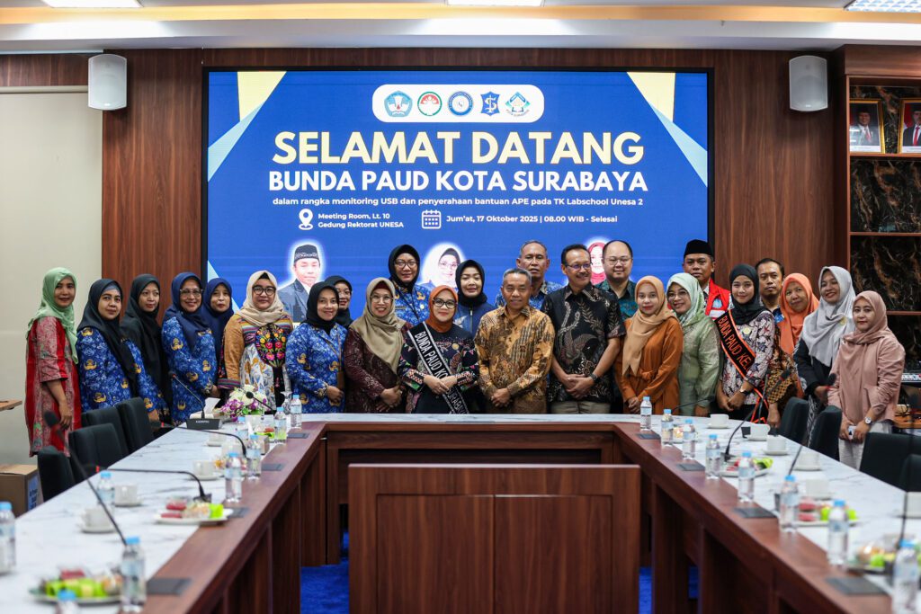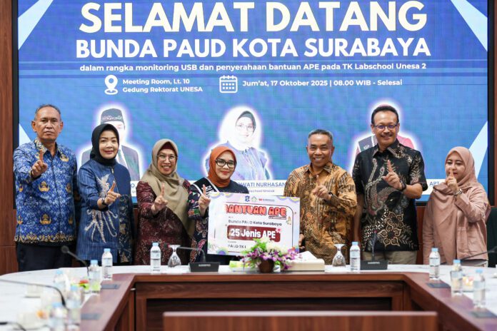 Surabaya 17 Oktober 2025 | Draft Rakyat Newsroom – Pemerintah Kota (Pemkot) Surabaya melalui Bunda PAUD Kota Surabaya melakukan tinjauan sekaligus memberikan apresiasi atas pembangunan unit sekolah baru, yakni Taman Kanak-Kanak (TK) Labschool 2 Universitas Negeri Surabaya (UNESA) Lidah Wetan. Apresiasi ini disampaikan bersamaan dengan penyerahan bantuan Alat Permainan Edukatif (APE) di gedung Rektorat UNESA pada Jumat (17/10/2025).