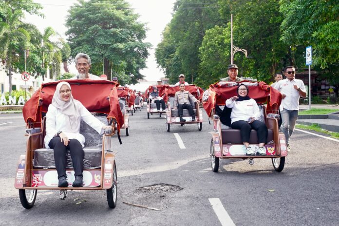 Bantuan tersebut diserahkan oleh Bupati Banyuwangi Ipuk Fiestiandani bersama Wakil Ketua Yayasan Gerakan Solidaritas Nasional (GSN) Nanik S Deyang, kepada para tukang becak yang selama ini menggantungkan hidup dari kayuhan tenaga, meski usia dan kondisi fisik tak lagi muda.
