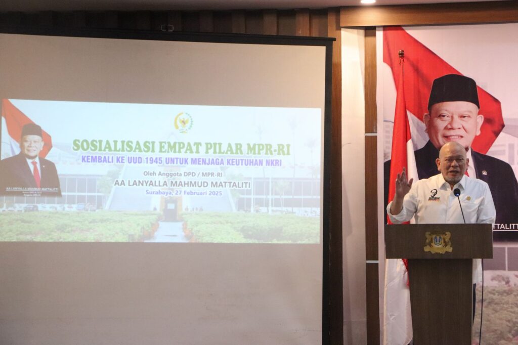 Namun, LaNyalla juga mengajak para mahasiswa untuk berpikir lebih kritis dalam melakukan koreksi atas apa yang terjadi di Indonesia. Terutama persoalan yang paling fundamental, yaitu Konstitusi Indonesia yang harus diperkuat agar Indonesia kembali berdaulat, berdikari dan berkepribadian. Hal itu disampaikan LaNyalla saat menjadi pembicara utama dalam Sosialisasi Empat Pilar MPR-RI dengan tema “Kembali ke UUD 1945 untuk menjaga Kebutuhan NKRI” di Surabaya, Kamis (27/2/2025).