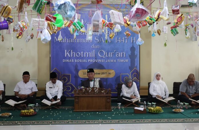Surabaya 11 September 2025 | Draft Rakyat Newsroom – Dinas Sosial (Dinsos) Jatim peringati Maulid Nabi Muhammad SAW 1447 Hijriah sekaligus Khotmil Quran di Masjid Al Ikhwan, lingkungan kantor Dinsos Jatim, Rabu (10/9/2025) pagi. Acara ini diikuti oleh seluruh pejabat, pegawai, serta jajaran staf dengan penuh khidmat dan semangat kebersamaan.