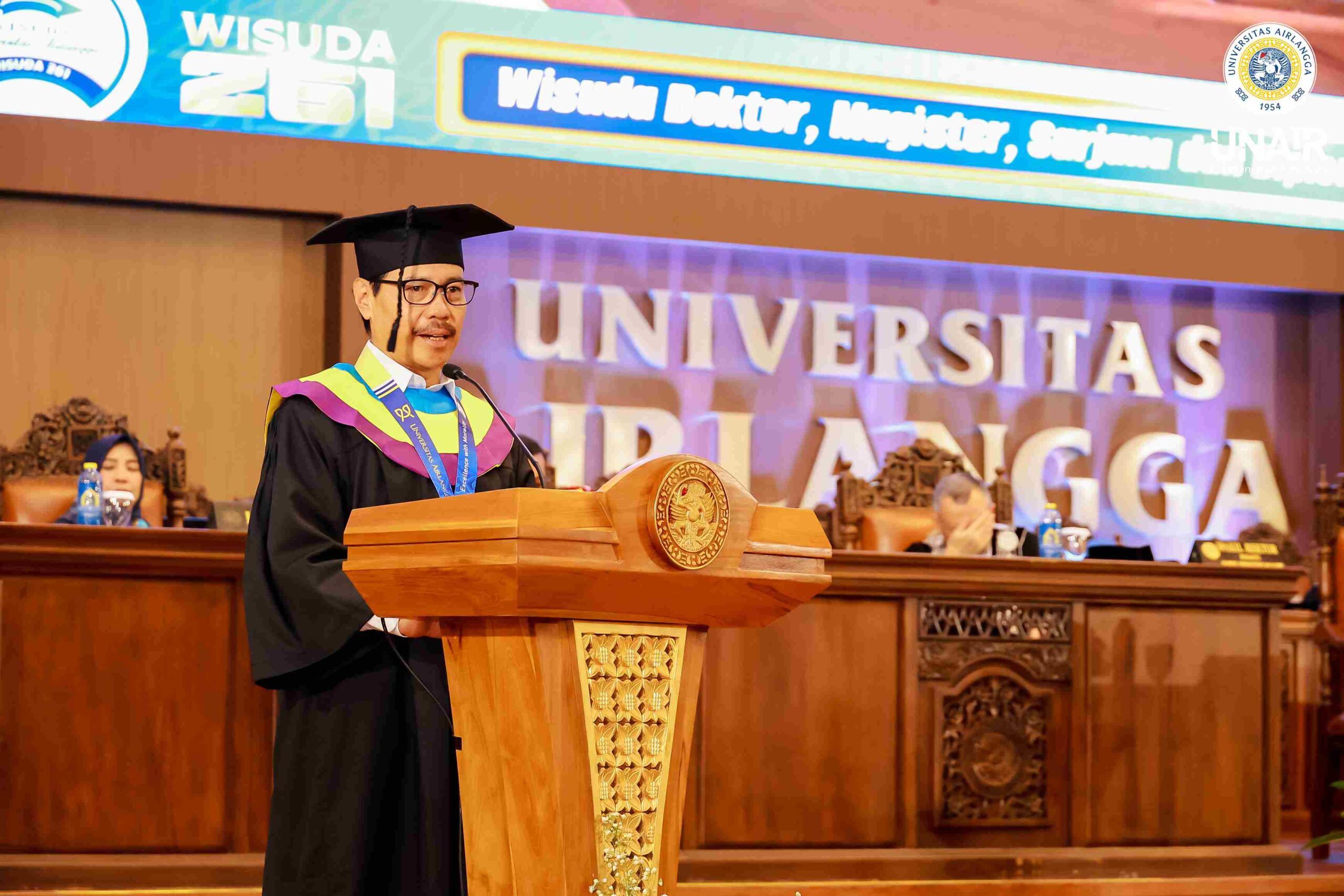 “Terima kasih kepada para pembimbing yang sudah membimbing kami selama berkuliah di UNAIR. Berkat arahan dan ilmu yang diberikan, apa yang kita hasilkan hari ini dapat bermanfaat secara luas bagi nusa dan bangsa,” imbuhnya.