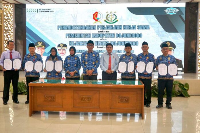 Surabaya 17 Desember 2025 | Draft Rakyat Newsroom – Bupati Bojonegoro, Setyo Wahono, menekankan pentingnya sinergi antara Pemerintah Daerah dengan aparat penegak hukum guna memastikan seluruh program pembangunan berjalan di koridor regulasi yang tepat. Langkah nyata dilakukan dengan penandatanganan kesepakatan bersama (MoU) terkait koordinasi hukum dan pendampingan di bidang pemerintahan. Kegiatan diselenggarakan di ruang Angling Dharma Lt 2 Pemkab Bojonegoro, Rabu (17/12/2025).