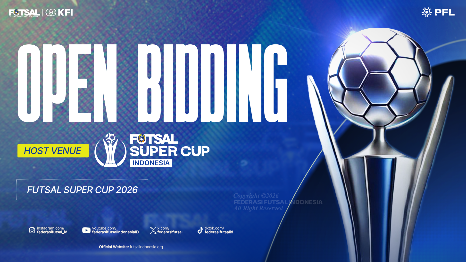 Jakarta 1 Maret 2026 | Draft Rakyat Newsroom – Federasi Futsal Indonesia (FFI) secara resmi mengumumkan pembukaan proses penawaran (bidding) untuk penetapan Tuan Rumah (Host City/Host Venue) kompetisi Futsal Super Cup 2026. Agenda ini merupakan bagian penting dari kalender kompetisi nasional FFI tahun 2026 yang bertujuan untuk meningkatkan standar penyelenggaraan futsal di Indonesia.