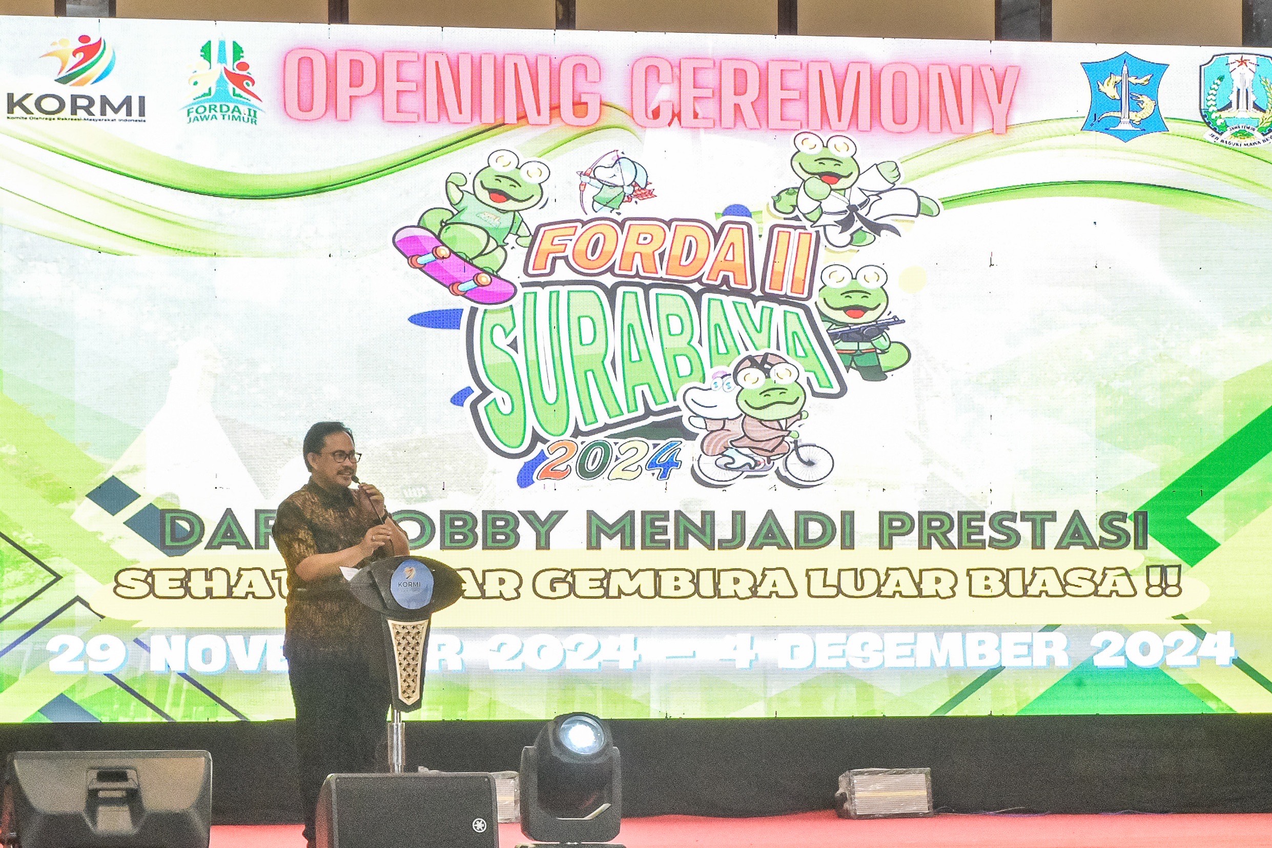 Surabaya 30 Nopember 2024 | Draft Rakyat Newsroom – Festival Olahraga Masyarakat Daerah (FORDA) II Komite Olahraga Masyarakat Indonesia (KORMI) Jawa Timur yang berlangsung mulai (29/11/2024) hingga (4/12/2024) di Kota Surabaya resmi dibuka. Festival olahraga yang bertujuan untuk melestarikan khasanah budaya bangsa itu, dibuka secara simbolis oleh Sekretaris Daerah (Sekda) Kota Surabaya Ikhsan bersama KORMI Jawa Timur bertempat di Convention Hall, Jalan Arief Rahman Hakim, Jumat (29/11/2024) malam.