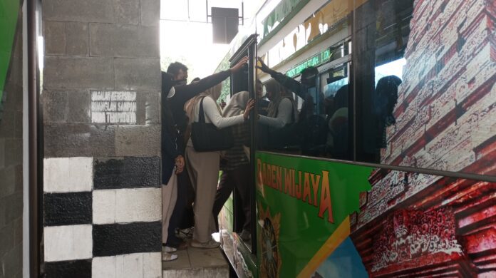 Sejak pagi hari, arus penumpang memang sudah menunjukkan peningkatan. Namun puncaknya terjadi pada jam-jam non-peak, sekitar pukul 11.00 hingga 14.00 WIB, ketika biasanya penumpang hanya datang dalam jumlah terbatas. Hari ini, bus penuh hingga ke lorong, banyak penumpang harus berdiri hingga perjalanan selesai.