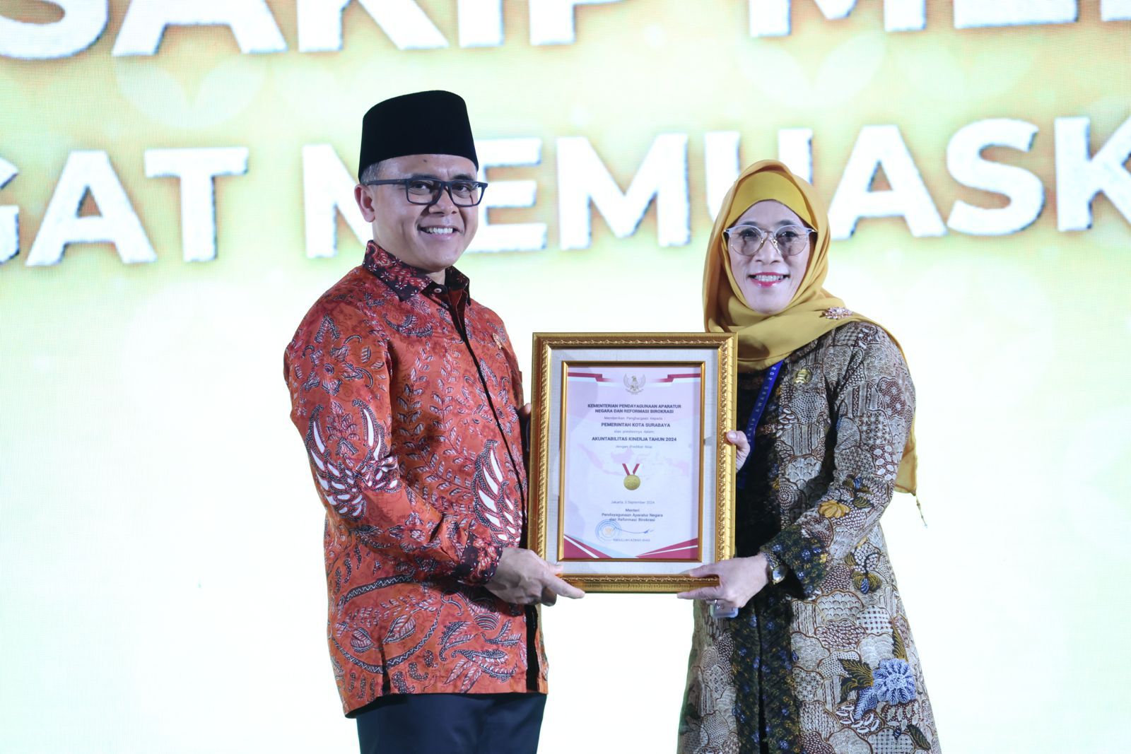 Surabaya 3 Oktober 2024 | Draft Rakyat Newsroom-Kota Surabaya mencatat sejarah sebagai kota pertama dan satu-satunya di Tanah Air yang berhasil meraih predikat AA (Sangat Memuaskan) dalam penilaian Sistem Akuntabilitas Kinerja Instansi Pemerintah (SAKIP). Penghargaan tersebut diserahkan langsung oleh Menteri Pendayagunaan Aparatur Negara dan Reformasi Birokrasi (PAN RB), Abdullah Azwar Anas, di Jakarta, Rabu (02/9/2024).