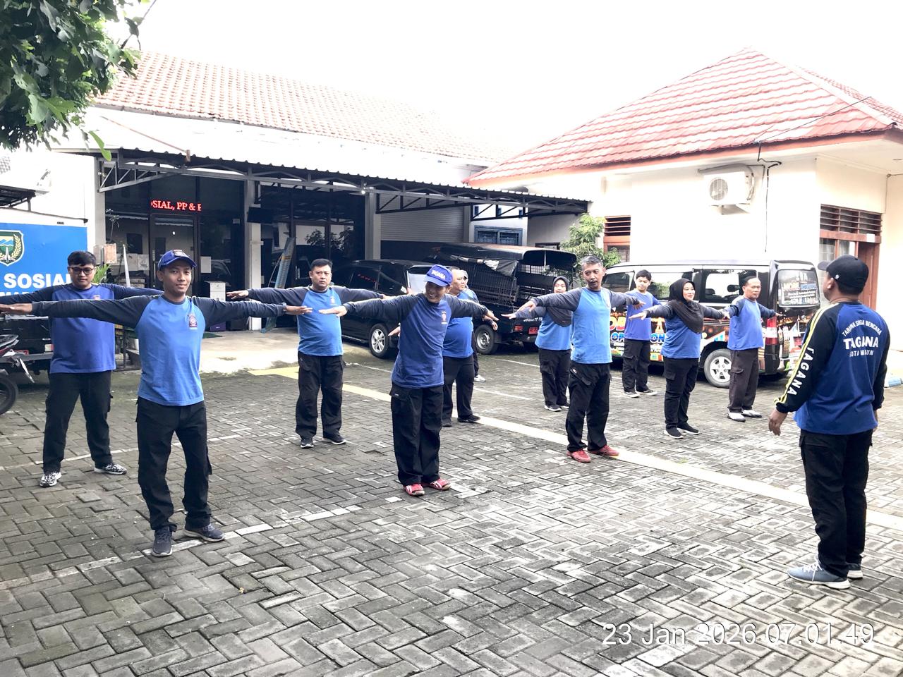 Untuk menjaga kebugaran fisik, Taruna Siaga Bencana (Tagana) Kota Madiun menggelar olahraga pagi dan jalan sehat bersama, Jumat (23/1). Kegiatan diawali dengan pemanasan yang dipimpin Koordinator Tagana Kota Madiun, Koirul Aspanuri, dengan gerakan peregangan dari kepala hingga kaki guna mengaktifkan otot dan melancarkan sirkulasi darah.