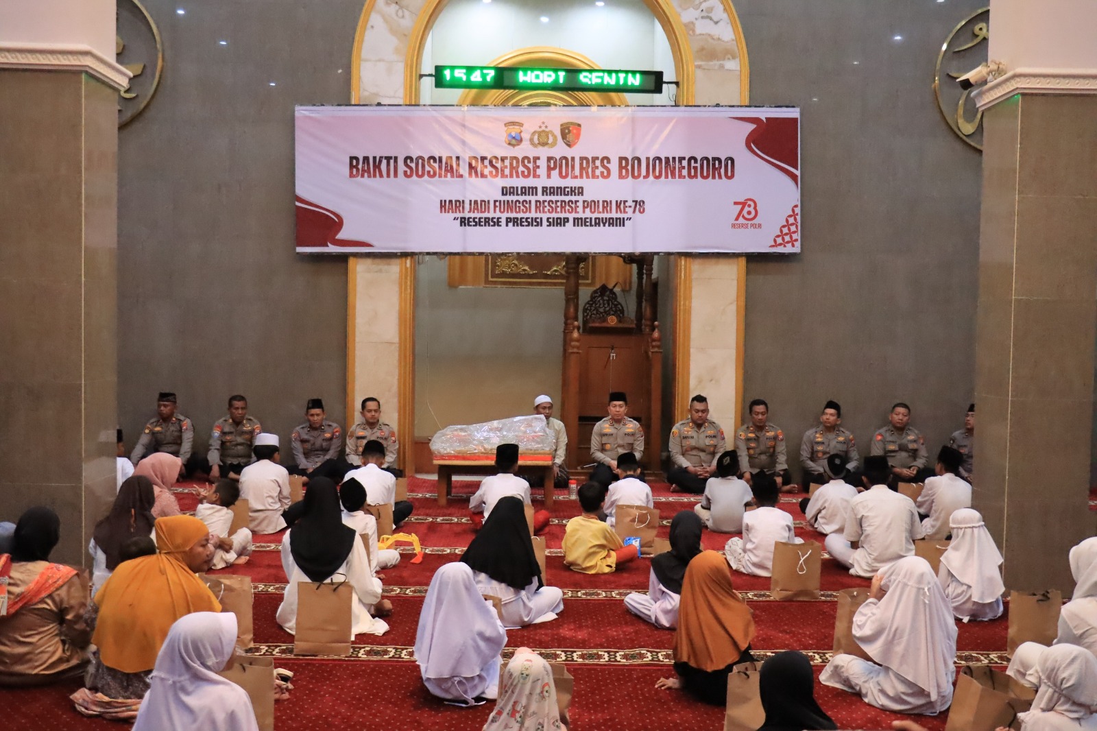 Kegiatan tasyakuran berlangsung di Masjid Al Ikhlas Polres Bojonegoro, Senin (8/12/2025) sore. Suasana berlangsung khidmat saat puluhan anak yatim memulai acara dengan doa bersama sebelum menerima santunan dari jajaran Satreskrim.