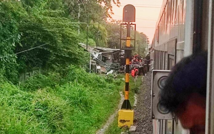 Surabaya 03 Juli 2025 | Draft Rakyat Newsroom Insiden kecelakaan antara Kereta Api (KA) Ambarawa Ekspres relasi Semarang Poncol – Surabaya Pasar Turi   menemper kendaraan forklift di perlintasan sebidang (JPL No. 393) Km 222+6/7 pada petak jalan antara Stasiun Kandangan dan Tandes, Surabaya, Rabu (02/07/2025), pukul 16.25 WIB sore.
