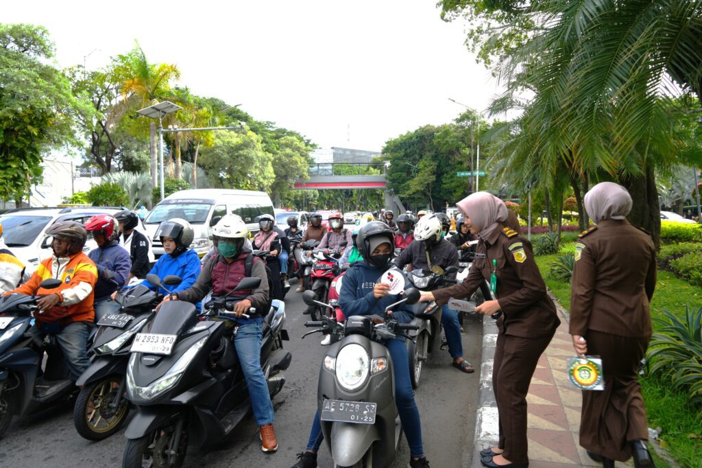 Selain kegiatan di atas, Kejati Jatim juga melakukan aksi simpatik dengan membagikan stiker dan souvenir bertemakan antikorupsi kepada masyarakat dan pengguna jalan.