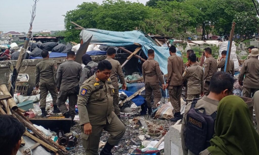 Surabaya 24 Desember 2024 | Draft Rakyat Newsroom – Pemerintah Kota (Pemkot) Surabaya melalui Satpol PP menertibkan bangunan liar (bangli) yang berada di area Tempat Pemakaman Umum (TPU) Putat Jaya, Selasa (24/12/2024). Sebanyak tiga bangunan semi permanen tersebut, ditertibkan petugas karena berdiri tanpa izin di area pemakaman.