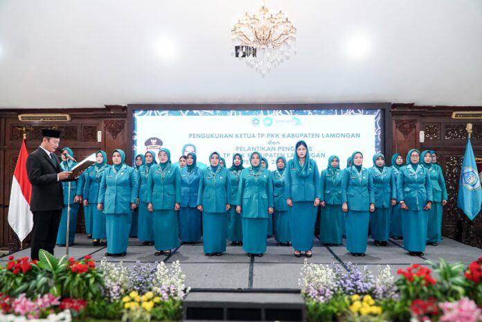 Surabaya 23 April 2025 | Draft Rakyat Newsroom – Bupati Lamongan Yuhronur Efendi mengukuhkan Ketua Tim Penggerak Pembinaan Kesejahteraan Keluarga (TP PKK) Kabupaten Lamongan Anis Kartika Yuhronur Efendi dan melantik pengurus TP PKK Kabupaten Lamongan, Rabu (23/4) di Pendopo Lokatantra.