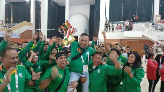 Sorak-sorai dan teriakan yel-yel “Jawa Timur” menggema di Balee Meuseuraya Banda Aceh. Ketua Muaythai Indonesia (MI) Jatim Baso Juherman yang hadir di lokasi pun tak luput dari sasaran luapan kegembiraan kontingen Jatim. Sambil menggenggam medali yang diraih, Baso diangkat beramai-ramai oleh seluruh atlet dan official. Setelahnya, Baso memeluk sejumlah atlet dan official sebagai bentuk kegembiraan dan rasa syukur.
