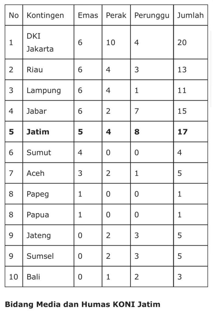 Surabaya 5 September 2024 | Draft Rakyat Newsroom-Pekan Olahraga Nasional (PON) XXI 2024 Aceh-Sumut belum resmi dibuka. Namun, sejumlah cabang olahraga (cabor) sudah mulai dipertandingkan dan beberapa atlet pun telah mendulang medali. Berdasarkan website resmi PON XXI 20224 Aceh-Sumut, kontingen Jawa Timur telah mengumpulkan 5 medali emas, 4 medali perak dan 8 medali perunggu.