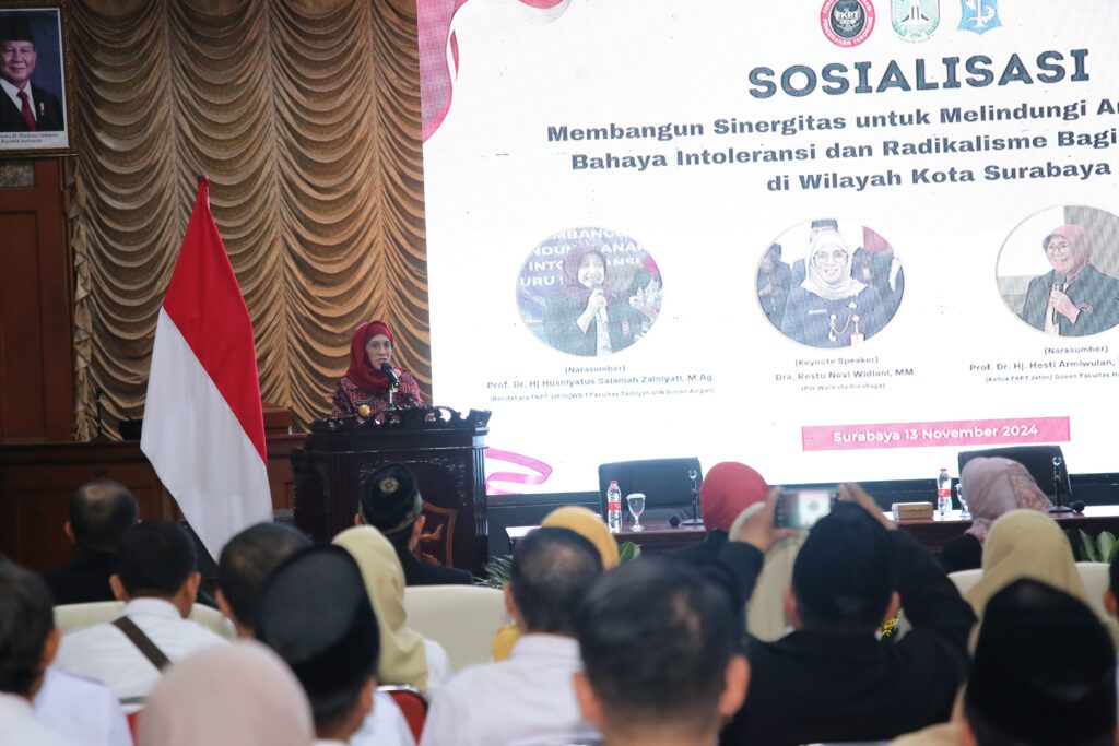 Sosialisasi bertajuk “Membangun Sinergitas untuk Melindungi Anak Bangsa dari Bahaya Intoleransi dan Radikalisme Bagi Guru SD-SMP” tersebut, dibuka langsung oleh Penjabat Sementara (PJs) Wali Kota Surabaya, Restu Novi Widiani.