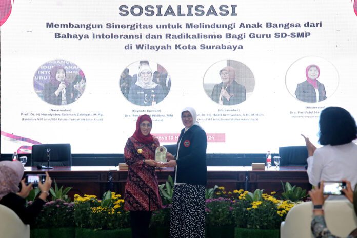 Sosialisasi bertajuk “Membangun Sinergitas untuk Melindungi Anak Bangsa dari Bahaya Intoleransi dan Radikalisme Bagi Guru SD-SMP” tersebut, dibuka langsung oleh Penjabat Sementara (PJs) Wali Kota Surabaya, Restu Novi Widiani.