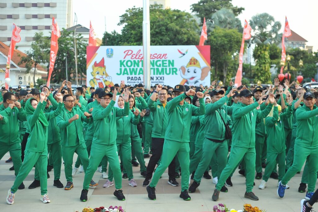 Pelepasan Kontingen Jawa Timur ini sendiri berjalan semarak. Di samping memberikan motivasi, Pj. Gubernur Adhy beserta segenap Forkopimda Jatim, Ketua Perwosi Jatim Arumi Bachsin Emil Dardak, dan para Kepala Perangkat Daerah Pemprov Jatim turut melakukan Flash Mop bersama dengan para atlet.(her)