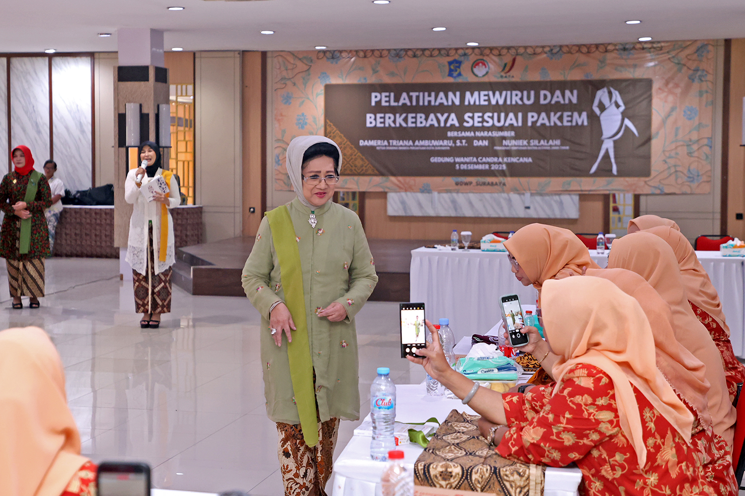 Surabaya 5 Desember 2025 | Draft Rakyat Newsroom – Pemerintah Kota (Pemkot) Surabaya Dharma Wanita Persatuan (DWP) menggelar pelatihan teknik mewiru kain jarit dan tata cara berkebaya yang sesuai pakem. Pelatihan ini, dihadiri oleh Ketua dan anggota DWP dari jajaran Perangkat Daerah (PD) serta Kecamatan se-Kota Surabaya.