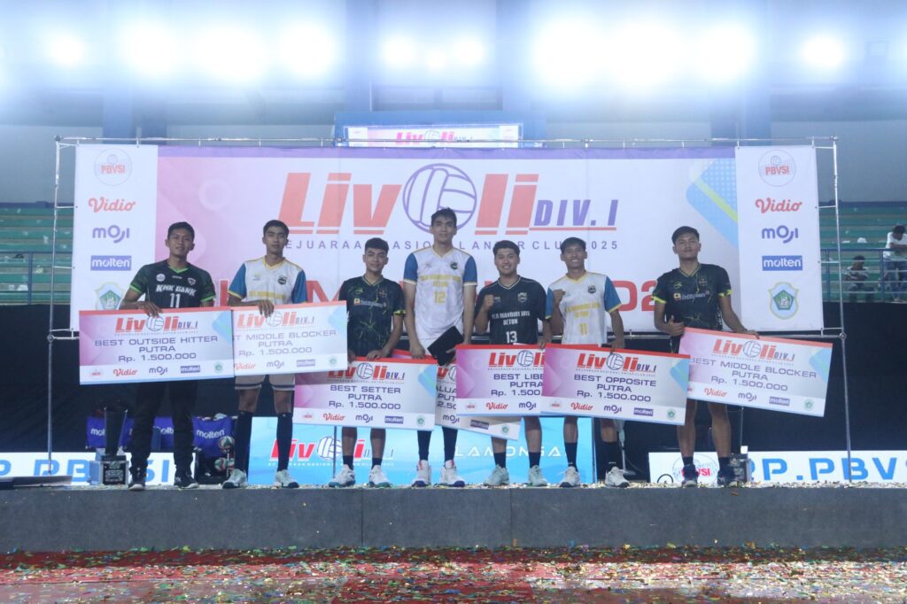 Surabaya 2 Nopember 2025 | Draft Rakyat Newsroom – Tim putra Eka Mandiri Jaya memantabkan sebagai juara pada Kejurnas Antarklub Livoli Divisi I Tahun 2025 usai mengalahkan PBV Bukit Asam Tsnjung Enim pada babak Final yang berlangsung di Sport Center Lamongan, Minggu (2/11/2025) malam.