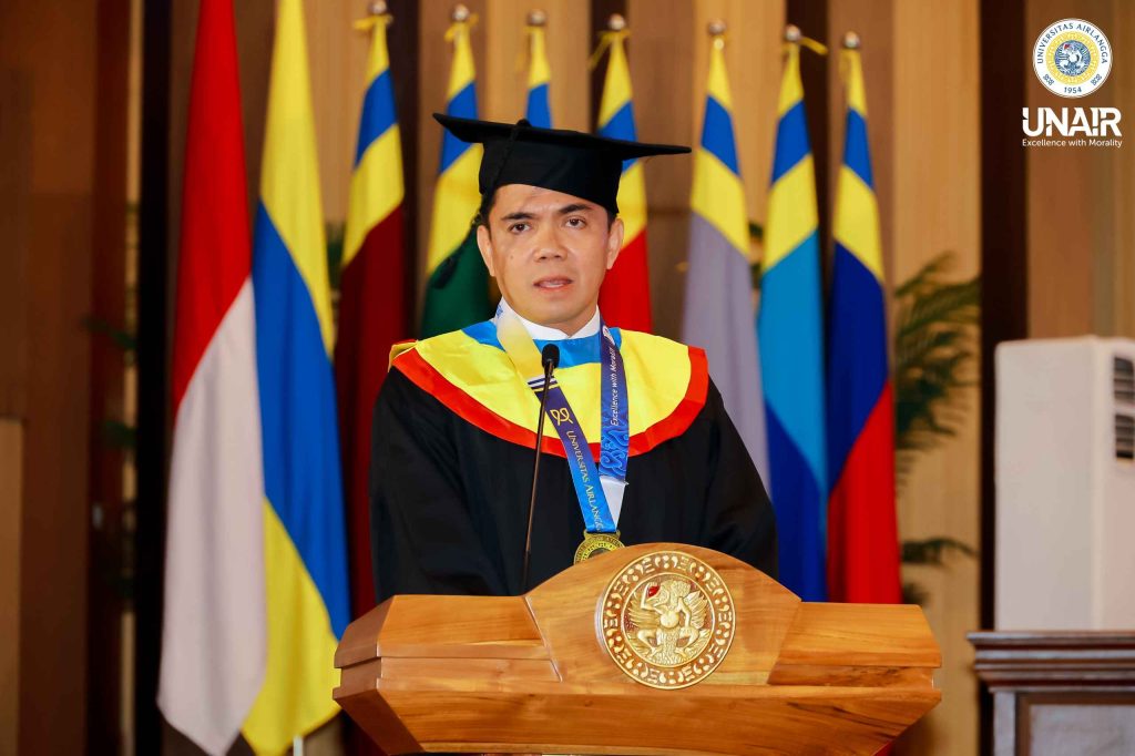 Ia melanjutkan, selama menjadi mahasiswa di UNAIR, ia mengaku tidak hanya diajarkan untuk mengetahui ilmu. Tetapi juga bagaimana menyelesaikan suatu masalah. “Inilah yang akan kami bawa ke depan. Semoga Ksatria Airlangga akan mampu menjalankan itu mengeksekusi segala mandat dan membuat UNAIR bangga untuk bangsa dan negara,” imbuhnya.
