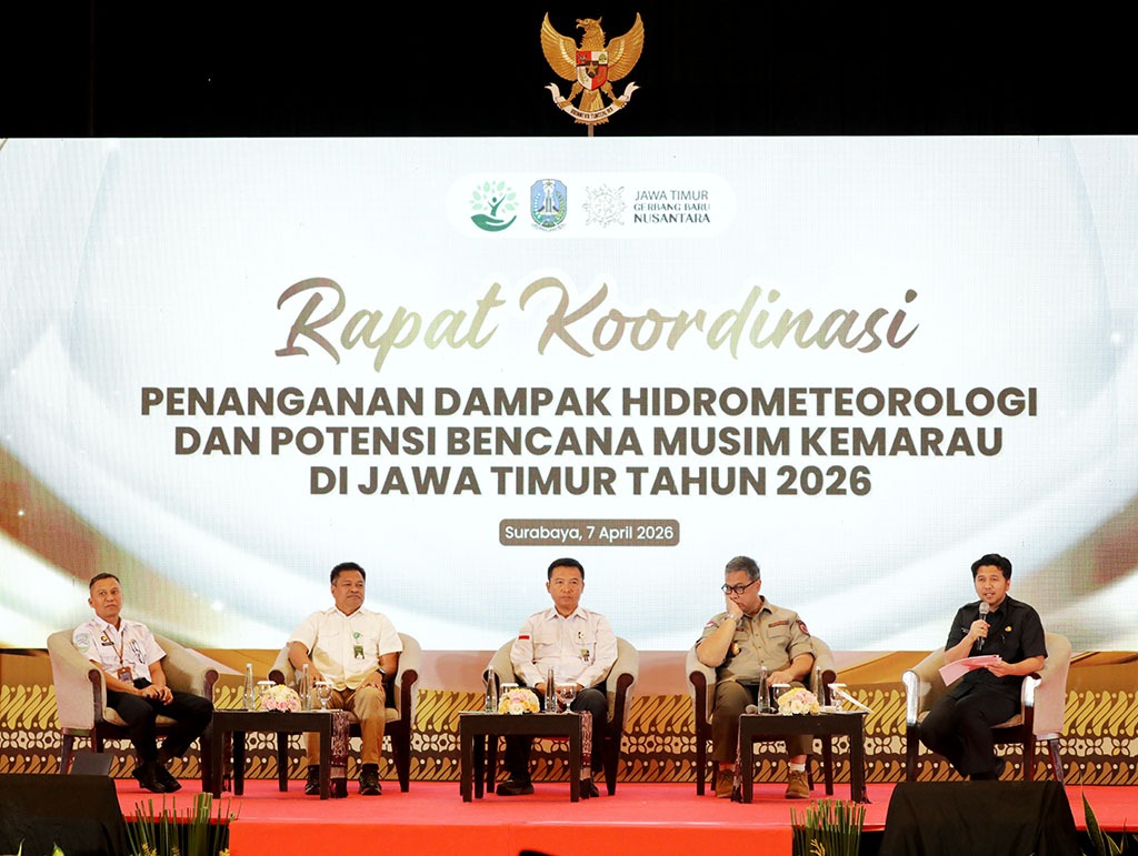 Hal tersebut disampaikannya dalam Rapat Koordinasi Penanganan Dampak Hidrometeorologi di Jawa Timur, Selasa (7/4/2026), yang menekankan pentingnya transformasi pendekatan dari reaktif menjadi preventif. Ia menilai bahwa pola penanganan berbasis respons cepat perlu dilengkapi dengan perencanaan berbasis risiko yang terukur dan berkelanjutan.