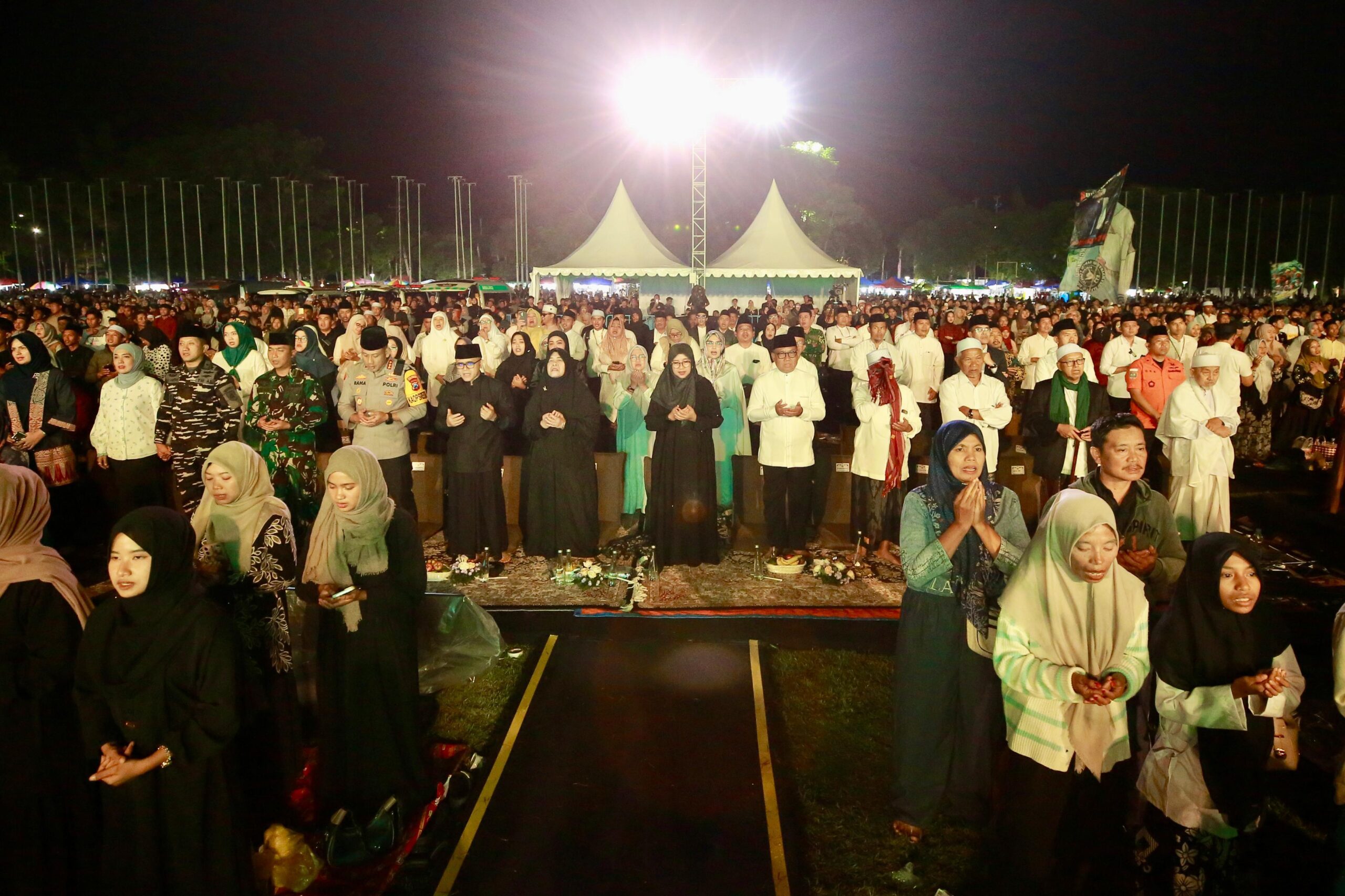 Surabaya 1 Januari 2026 | Draft Rakyat Newsroom – Kabupaten Banyuwangi menutup malam pergantian tahun, Rabu (31/12/2025), dengan muhasabah dan doa bersama di Alun-alun Taman Blambangan. Ribuan jamaah, tokoh agama, kiai, dan pejabat daerah larut dalam suasana khusyuk, bermunajat memohon keberkahan untuk Banyuwangi di tahun mendatang.