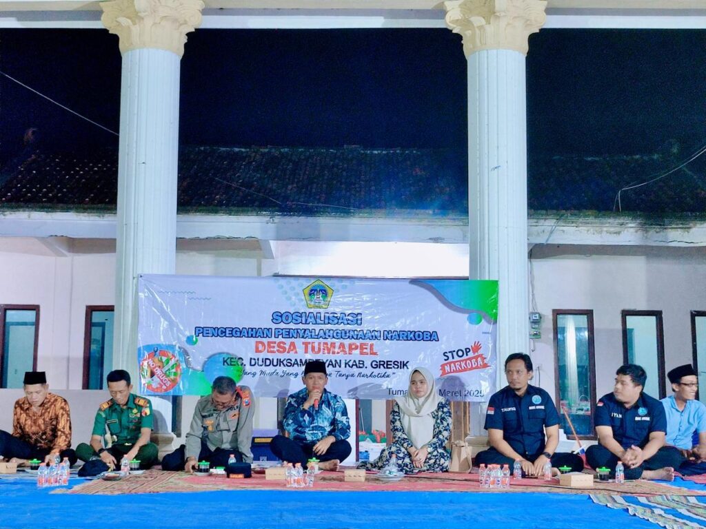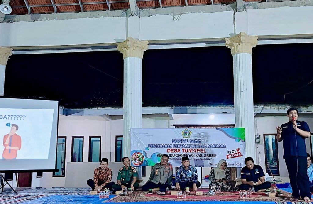 Surabaya 24 Maret 2025 | Draft Rakyat Newsroom – Untuk mencegah penyalahgunaan narkoba, khususnya di kalangan pemuda Desa Tumapel, Pemerintah Desa Tumapel Kecamatan Duduksampeyan Kabupaten Gresik bekerja sama dengan Forum Komunikasi Pimpinan Kecamatan (Forkopimcam) Duduksampeyan mengadakan sosialisasi mengenai bahaya narkoba. Kegiatan ini dilaksanakan pada Minggu (23/03/2025) dengan tema ‘Pemuda Desa Bersinar’ yang berarti pemuda desa yang bebas dari narkoba.