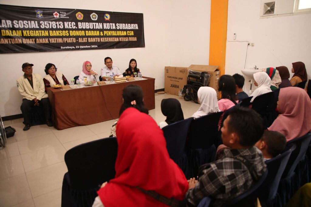 Surabaya 23 Oktober 2024 | Draft Rakyat Newsroom – Pemerintah Kota (Pemkot) Surabaya bersama Pilar Sosial 357813 menggelar bakti sosial (baksos) donor darah dan penyaluran bantuan untuk anak yatim piatu serta kursi roda untuk warga di wilayah Kecamatan Bubutan, Rabu, (23/10/2024). Dalam kegiatan ini, puluhan warga tampak antusias mengikuti donor darah di kantor Kecamatan Bubutan.