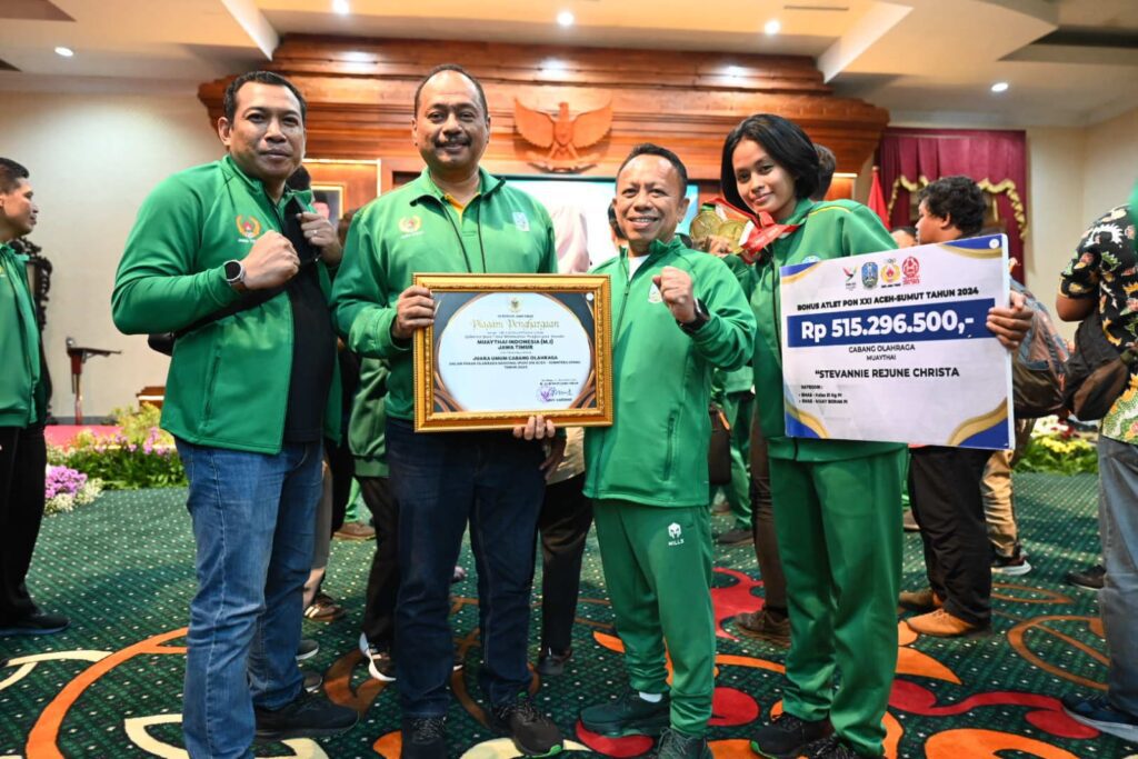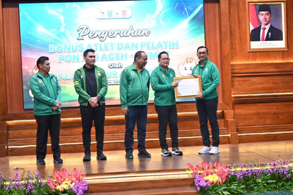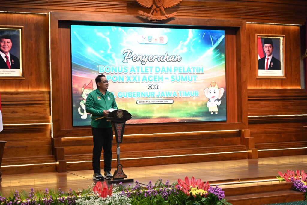 Surabaya 12 Desember 2024 | Draft Rakyat Newsroom – Pemerintah Provinsi Jawa Timur bersama Komite Olahraga Nasional Indonesia (KONI) Jatim memberikan bonus kepada atlet dan pelatih peraih medali PON XXI/2024 Aceh Sumatera Utara di Gedung Negara Grahadi, Rabu (11/12).
