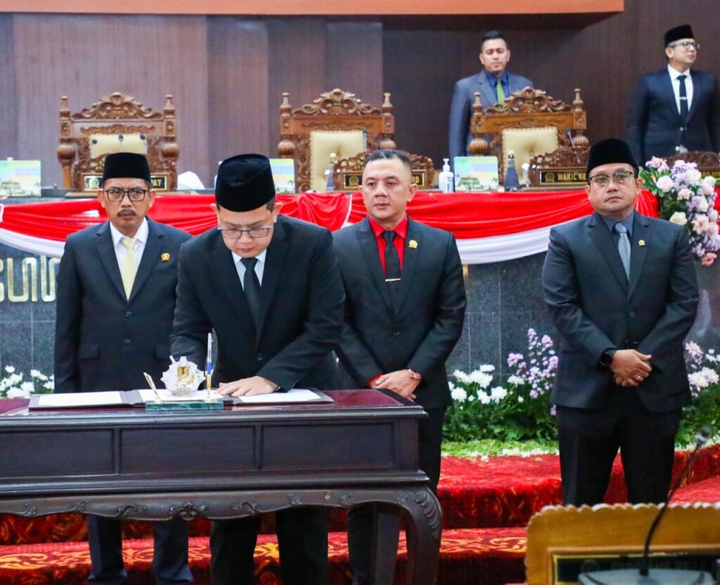 Penetapatan Perda tersebut ditandai dengan penandatanganan antara eksekutif yang dilakukan langsung oleh Pj. Gubernur Adhy bersama jajaran legislatif yang dilakukan oleh Ketua DRPD Jatim M. Musyafak yang disaksikan oleh Wakil Ketua DPRD Jatim.