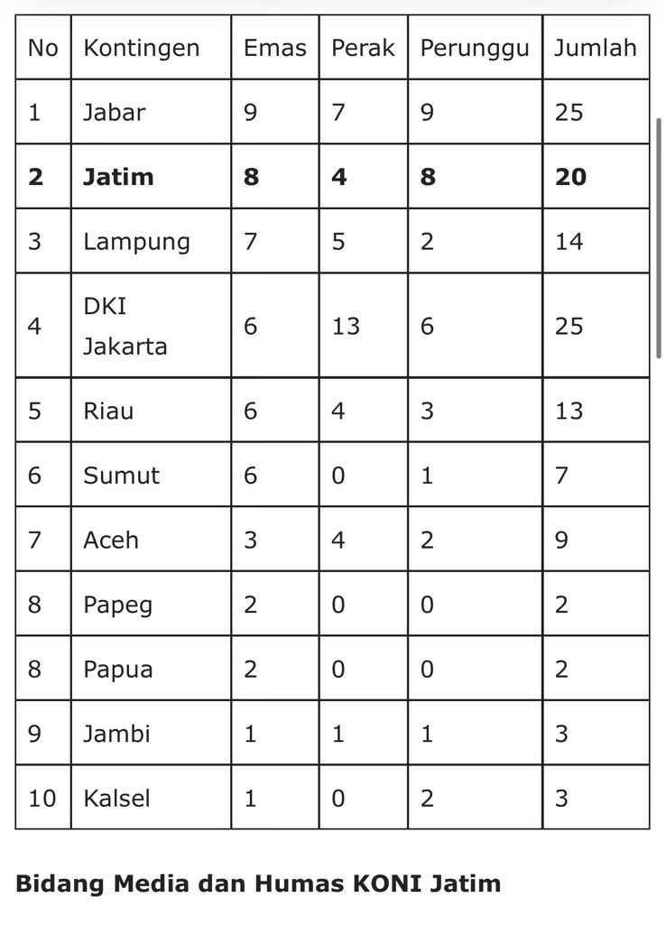 Jabar berhasil memimpin dengan total 24 medali, terdiri dari 9 emas, 6 perak, dan 9 perunggu.