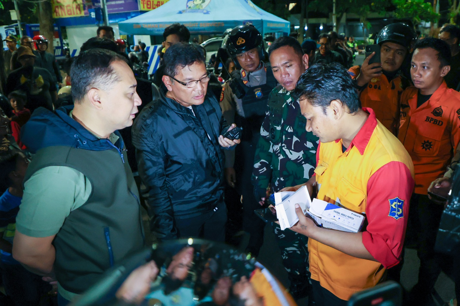 Setelah meninjau titik parkir Taman Bungkul, Cak Eri bersama jajaran TNI/Polri bergeser ke Taman Apsari. Di titik ini, ia juga mengecek satu persatu kelengkapan fasilitas jukir dan parkir di area tersebut.