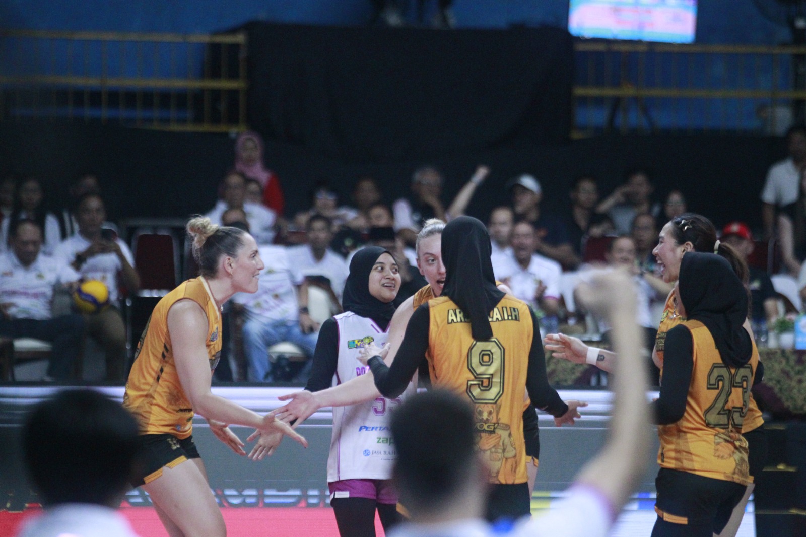 Namun, Dewi Intan Sari dan kawan-kawan bangkit pada set kedua dengan tampil lebih menekan, terutama melalui dua pemain asingnya Polina Shemanova dan Kelsey Marie Robinson Cook. Hasilnya, mereka menang 25-20.