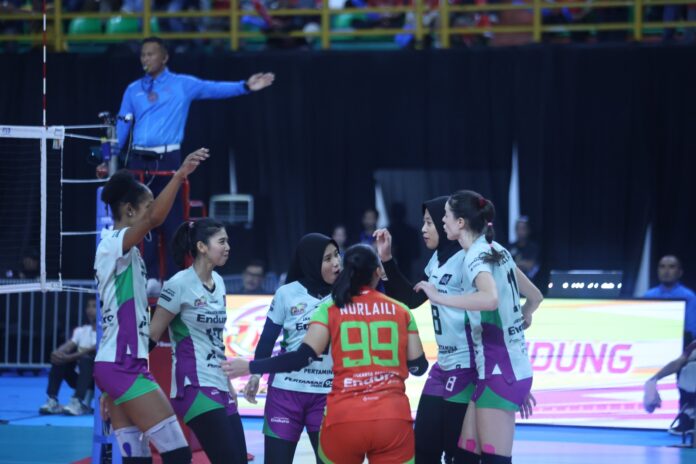 Bandung 24 Januari 2026 | Draft Rakyat Newsroom – Juara bertahan Jakarta Pertamina Enduro (JPE) meraih poin penuh usai menumbangkan Jakarta Popsivo Polwan tiga set tanpa balas dengan skor 3-0 (25-23, 25-18,25-22) seri ketiga putaran pertama Proliga 2026 yang berlangsung di GOR Sabilulungan Jalak Harupat, Kabupaten Bandung,, Jumat (22/1/2026) malam.