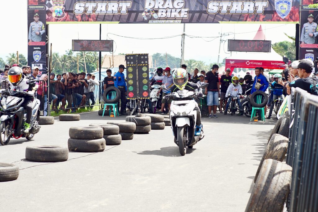 Surabaya 13 April 2025 | Draft Rakyat Newsroom – Sebanyak 200 dragster dari berbagai daerah di Jawa Timur unjuk kemampuan dalam Kejuaraan Provinsi (Kejurprov) Drag Bike Kapolresta Cup 2025. Ajang adu akselerasi sepeda motor ini digelar di Jalan Wiroguno, Desa Dasri, Kecamatan Tegalsari, Banyuwangi, Minggu (13/4/2025).