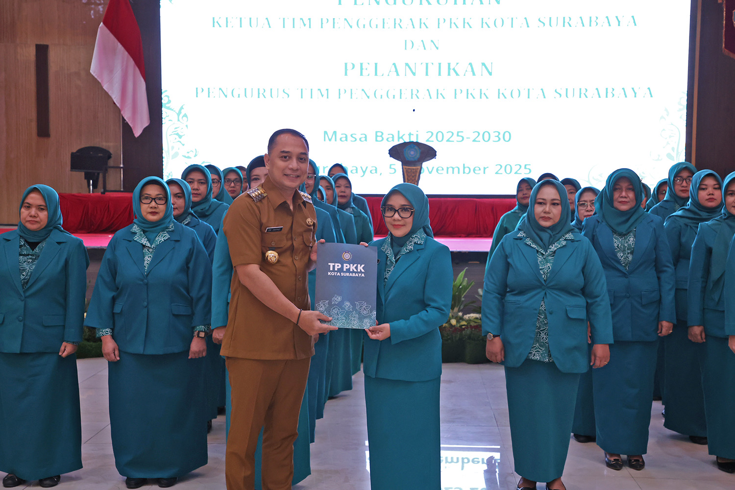 Surabaya 5 Nopember 2025 | Draft Rakyat Newsroom – Wali Kota Surabaya, Eri Cahyadi, secara resmi mengukuhkan Rini Indriyani sebagai Ketua Tim Penggerak (TP) PKK Kota Surabaya beserta seluruh jajaran pengurus masa bakti 2025–2030, di Gedung Wanita Candra Kencana, Rabu (5/11/2025). Pengukuhan ini bukan sekadar seremonial, melainkan awal dari gerakan masif yang akan mengubah kebiasaan warga hingga potensi dan masa depan remaja.