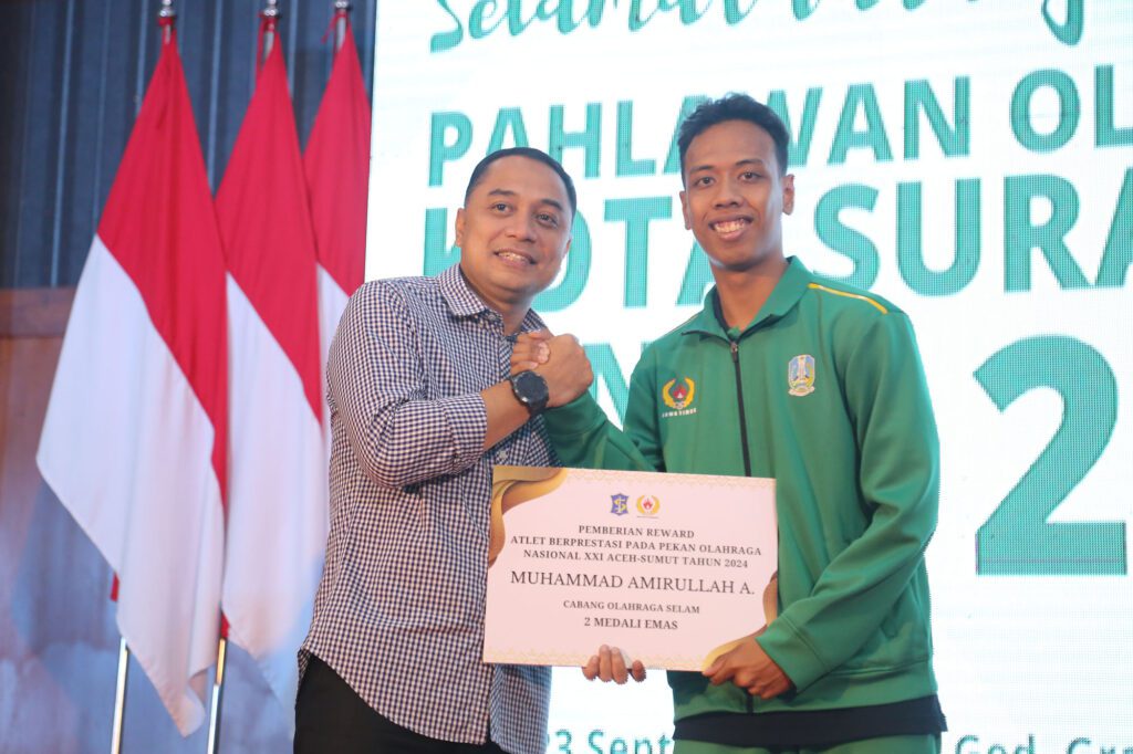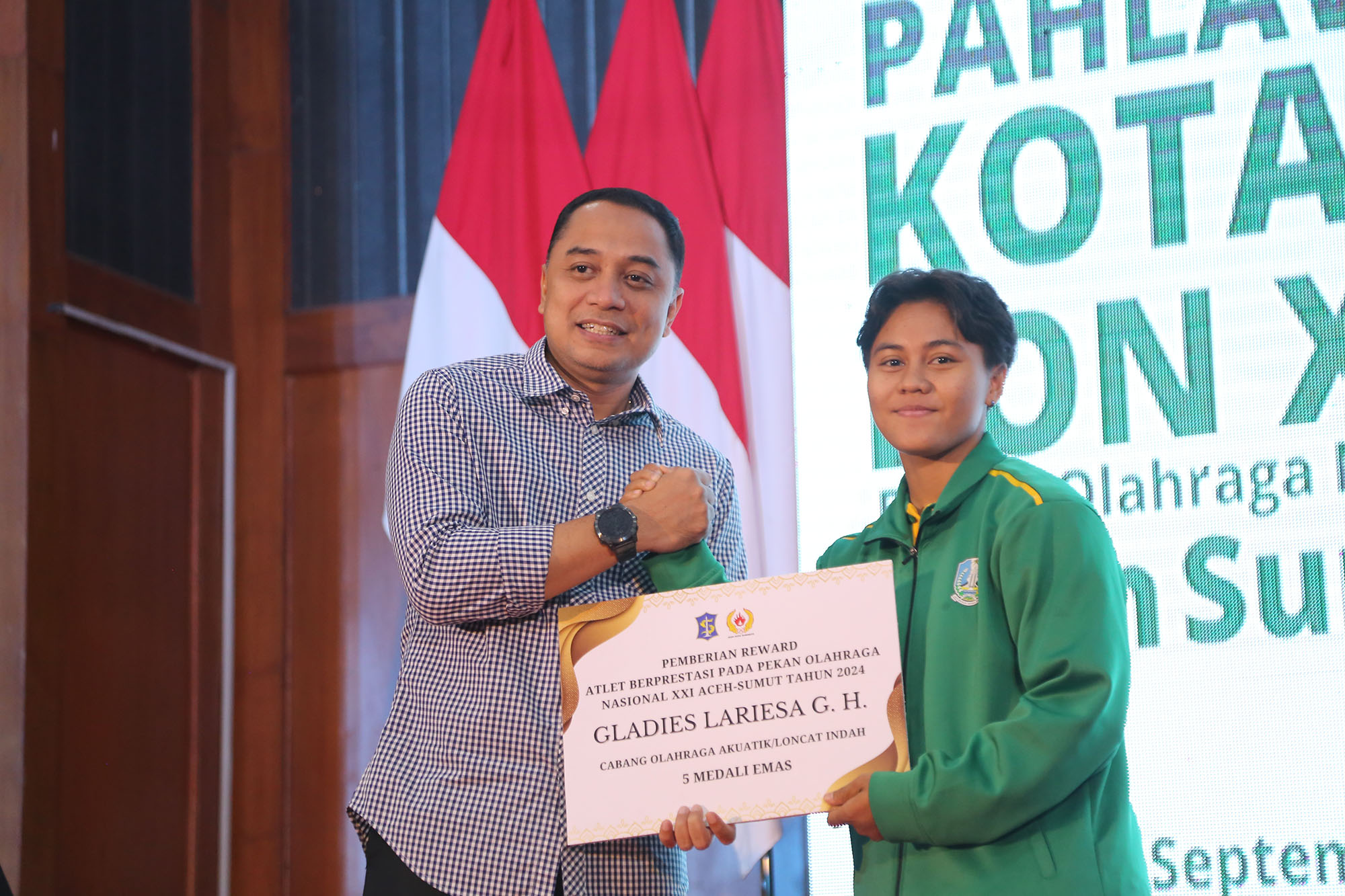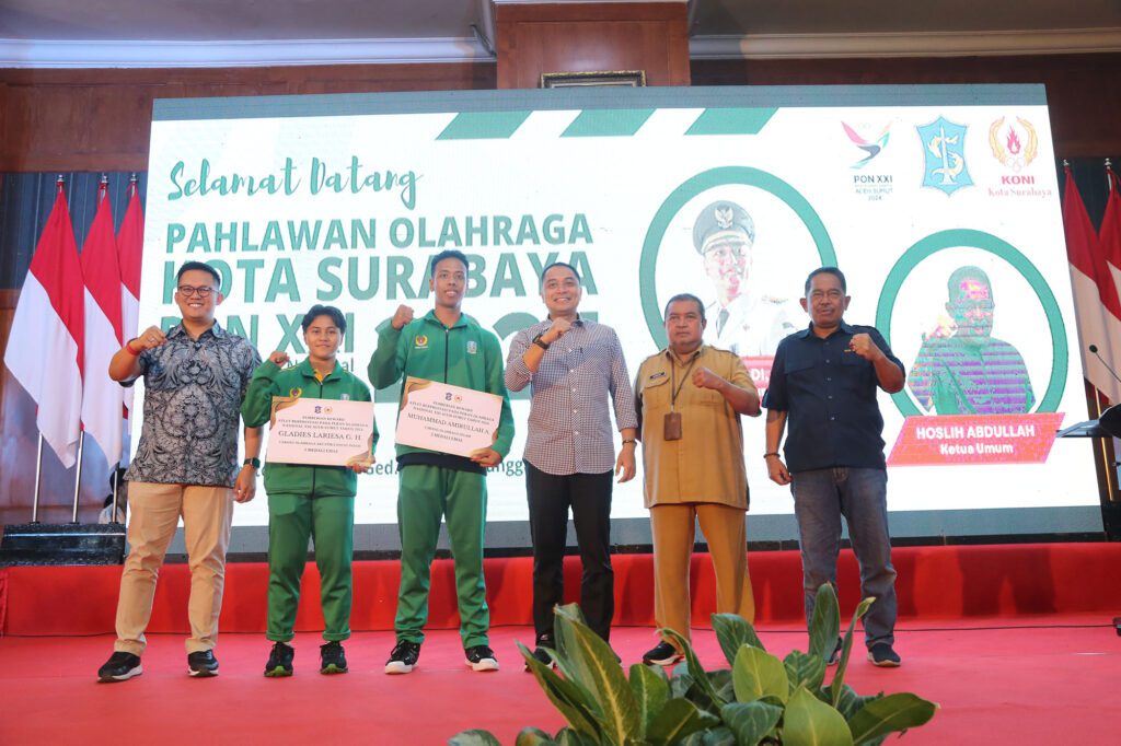 Dalam kesempatan itu, Wali Kota Surabaya, Eri Cahyadi, sekaligus menyerahkan reward kepada atlet berprestasi dalam PON Aceh-Sumut 2024. Secara simbolis reward diberikan kepada dua perwakilan atlet berprestasi.