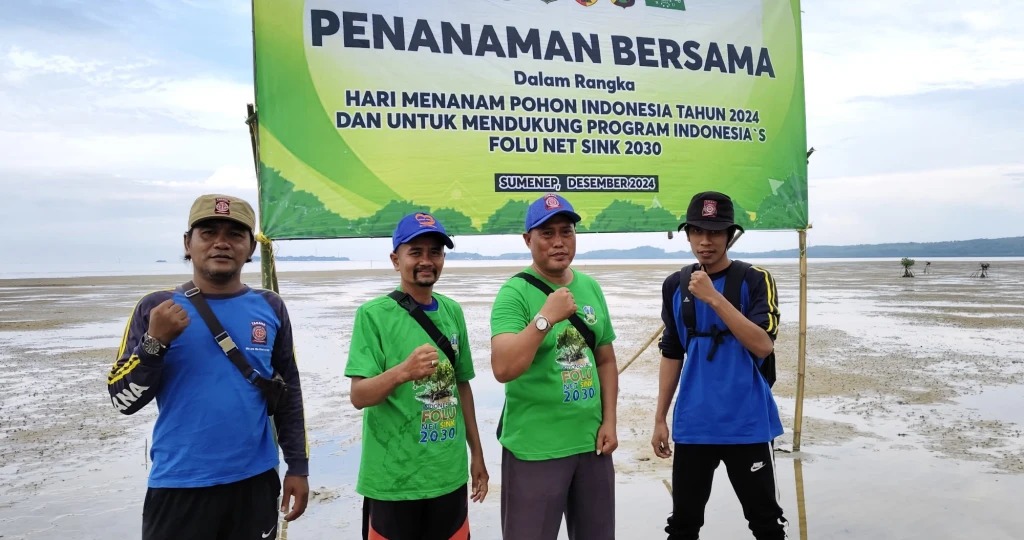 Surabaya 31 Desember 2024 | Draft Rakyat Newsroom –  Kegiatan penanaman mangrove secara serentak dilaksanakan di Pantai Jambu Mente, Dusun Berak Sabe, Desa Angkatan, Kecamatan Arjasa, Kabupaten Sumenep, dalam rangka Hari Menanam Pohon Indonesia 2024, Senin (30/12/2024). Kegiatan ini mendukung program Indonesia’s Folu Net Sink 2024, yang bertujuan mengurangi emisi karbon dan mencegah abrasi di wilayah pesisir.