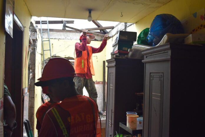 “Kami membantu menurunkan atap dan memotong struktur bangunan agar proses pembongkaran berjalan aman tanpa merusak bagian lain. Upaya ini kami lakukan agar prosesnya lebih lancar,” ujar dia.