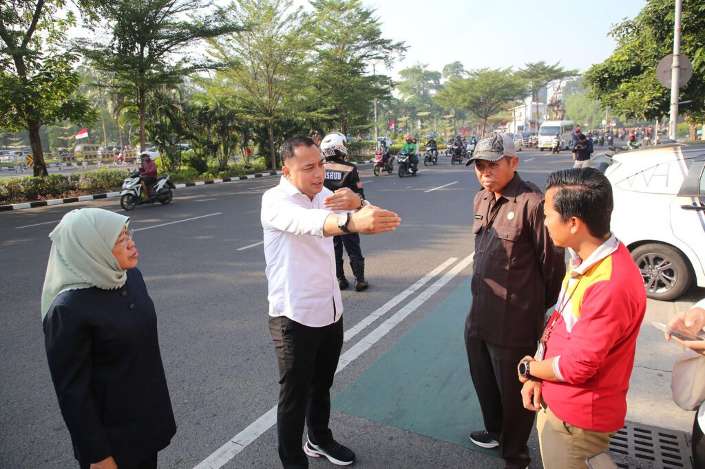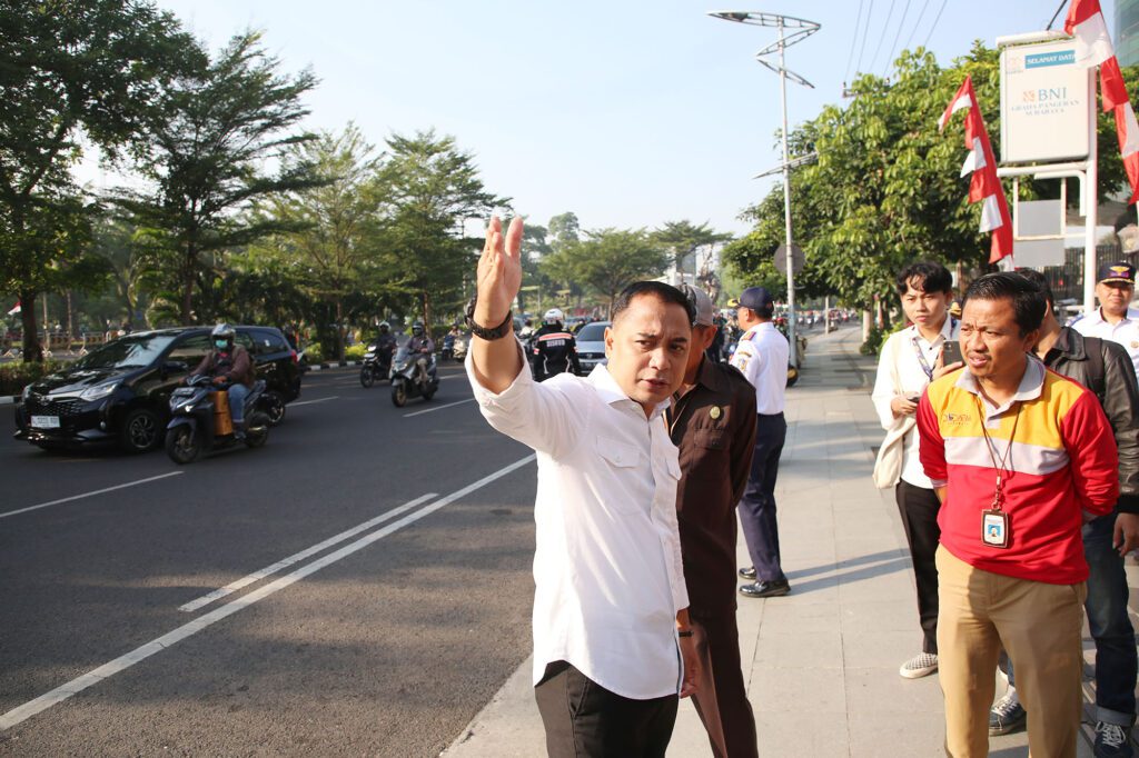 Surabaya 6 Agustus 2024 | Draft Rakyat Newsroom-Wali Kota Surabaya Eri Cahyadi melakukan inspeksi mendadak (sidak) persiapan pengerjaan overlay (pengaspalan) dan box culvert di kawasan Jalan Ahmad Yani, Selasa,(6/8/2024), pagi. Pengerjaan overlay dilakukan untuk memperbaiki kualitas jalan.