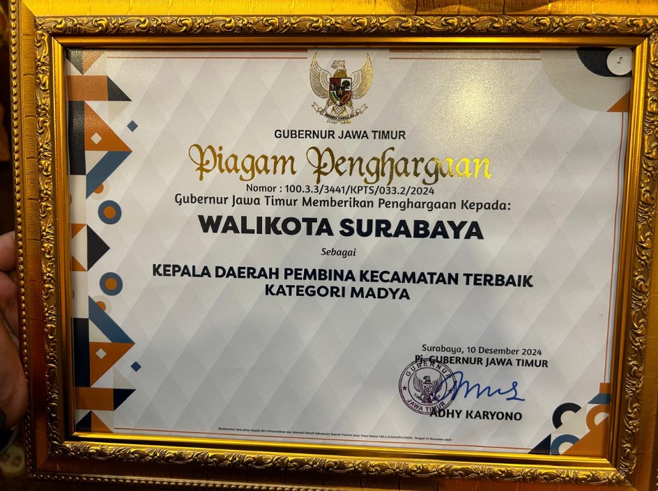 Penghargaan tersebut diserahkan bersamaan dalam acara Rapat Pembinaan Kecamatan Provinsi Jawa Timur 2024. Kegiatan ini digelar di Badan Pengembangan Sumber Daya Manusia (BPSDM) Jawa Timur, Jalan Balongsari Tama, Surabaya, Selasa (10/12/2024).