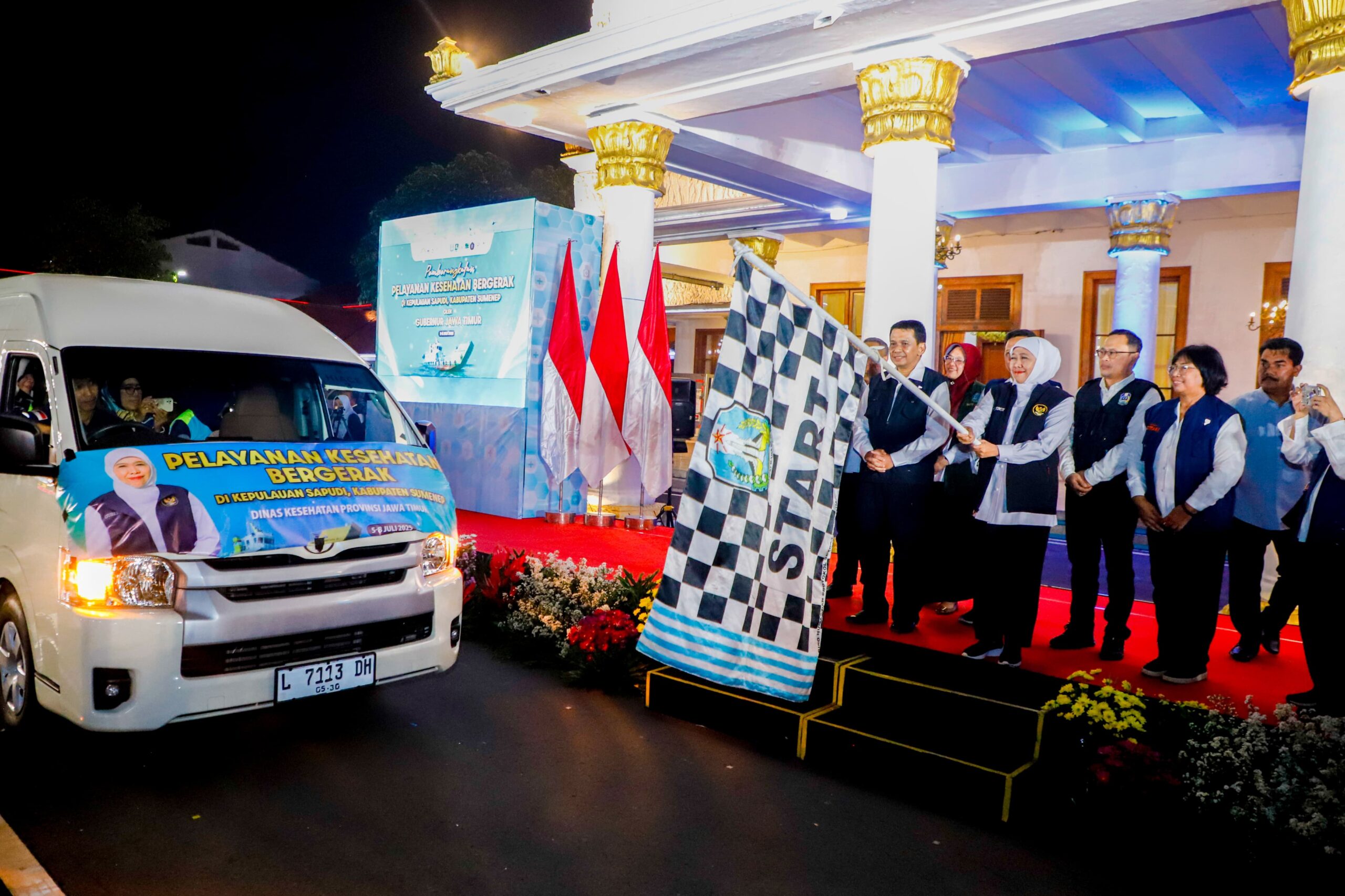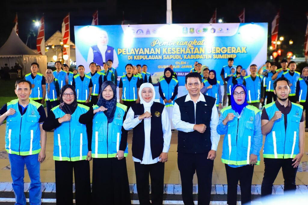 Surabaya 05 Juli 2025 | Draft Rakyat Newsroom Gubernur Jawa Timur Khofifah Indar Parawansa memberangkatkan 52 Tim Pelayanan Kesehatan (Yankes) Bergerak ke Pulau Sapudi, Kabupaten Sumenep dari halaman Gedung Negara Grahadi pada Sabtu, (5/7) dini hari.
