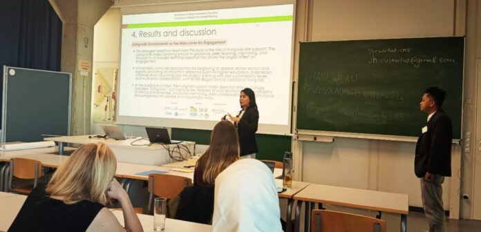 Presentasi kedua dari Jauhar Wahyuni, dengan mengangkat tema ‘Inclusive Student Engagement in Urban Sustainability: AI Literacy, Gender Equality, and Living Labs for Civic Innovation.’ Penelitian ini menyoroti bagaimana Unesa membangun ekosistem literasi AI, kesetaraan gender, dan Living Labs sebagai katalis peningkatan kompetensi mahasiswa untuk dunia kerja abad ke-21.