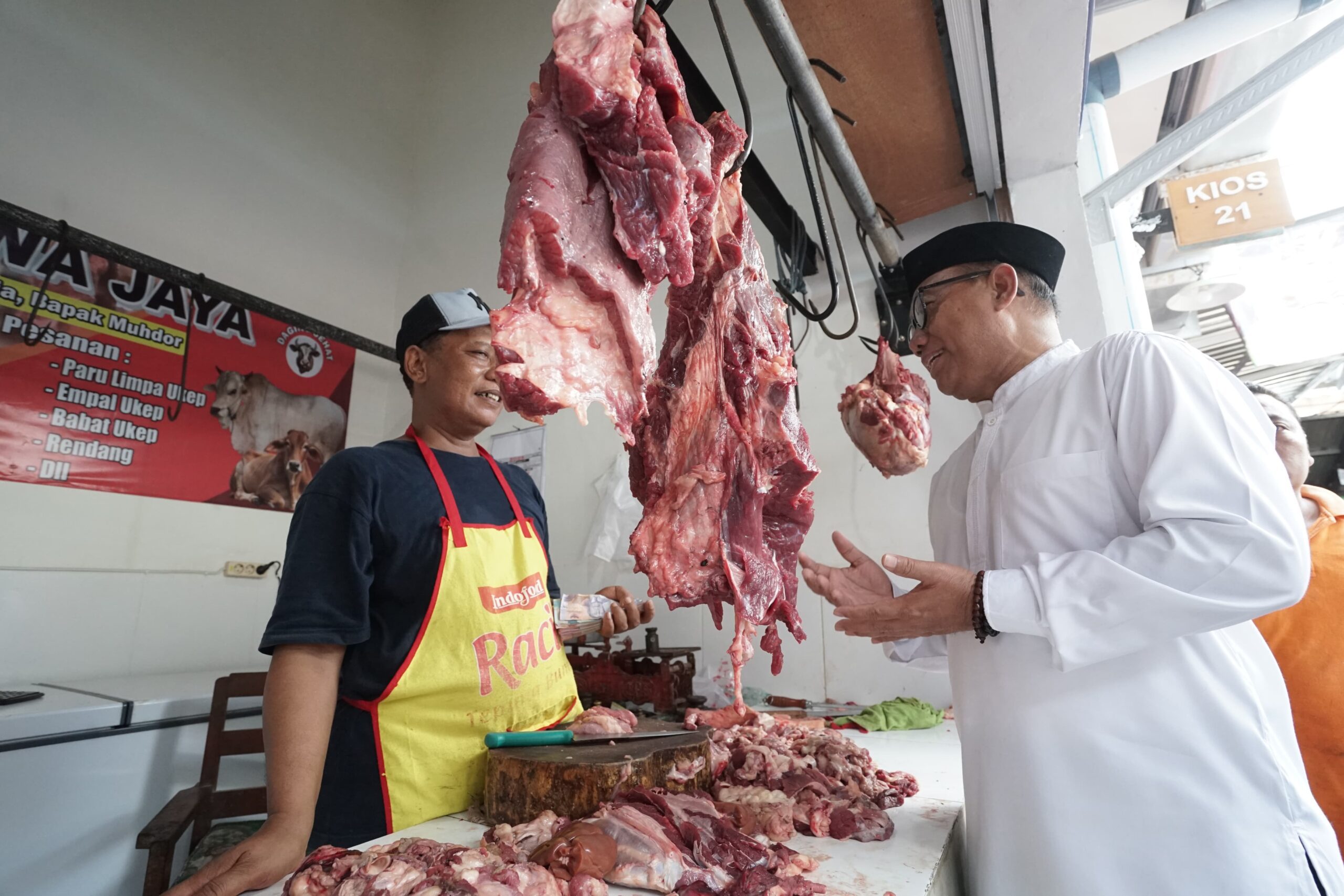 Mujiono berkeliling pasar memantau harga sembako mulai dari harga daging ayam, daging sapi, beras, minyak goreng, hingga bawang dan cabai.