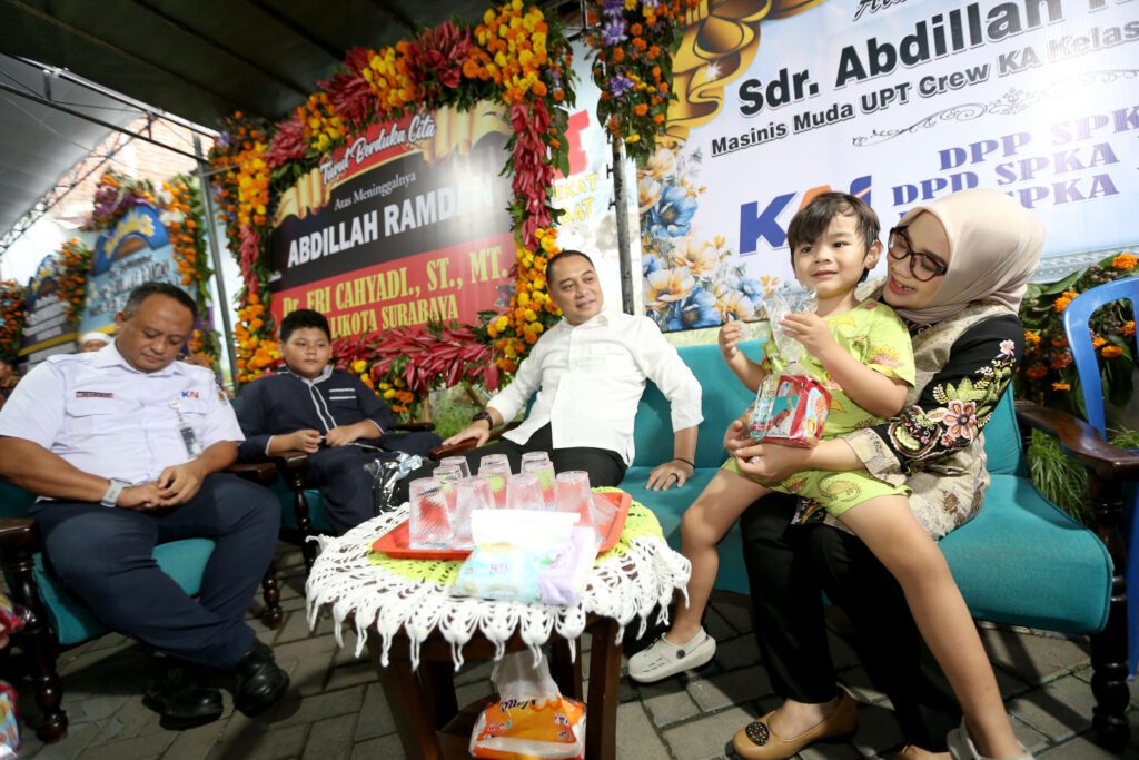 Surabaya 10 April 2025 | Draft Rakyat Newsroom – Wali Kota Surabaya Eri Cahyadi bersama istrinya Rini Indriyani takziah ke kediaman korban kecelakaan kereta api dengan truk bermuatan kayu, Abdilah Ramdan, Kamis, (10/4/2025) sore. Dalam kesempatan itu, Wali Kota Eri Cahyadi turut didampingi oleh Camat Semampir, M. Yunus, Executive Vice President (EVP) KAI Daop 8 Surabaya, Wisnu Pramudyo, serta keluarga besar almarhum Abdilah Ramdan.